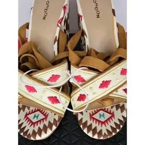 Step out in style with these Z London Veloce ankle lace-up sandals. The tribal-inspired design with Aztec accents and a London theme is perfect for any occasion, whether it's a wedding, party, or casual outing. These shoes were originally sold by Target. The open toe and 4-inch platform height provides comfort and support, while the ultra-high block heel adds a touch of elegance. These sandals are available in size 8.5 and come in a beige color with ankle strap accents. The textile upper material and standard shoe width make them suitable for any season, whether it's summer, fall, or spring. Add these stylish sandals to your collection today!