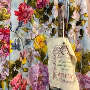Chic Aratta blouse with vibrant floral patterns. Features a mix of pink, yellow, and green hues. Perfect for a stylish look.