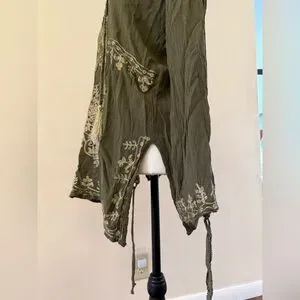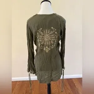 olive green, long-sleeved tunic features intricate, cream-colored embroidery in floral and mandala-inspired patterns.