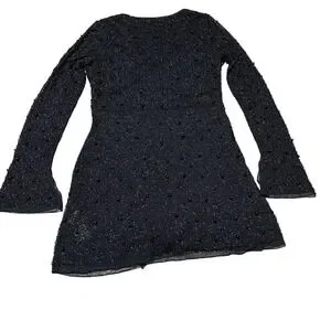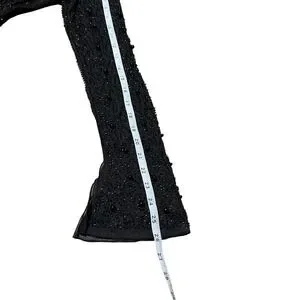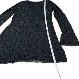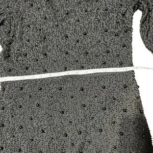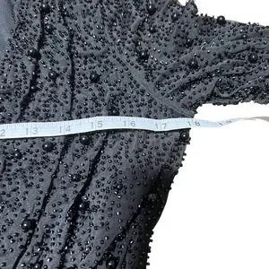 Turn heads and captivate any room in this stunning black beaded mesh dress. Its alluring wrap silhouette cinches your waist, creating a flattering and feminine hourglass figure that accentuates your natural curves. The intricate beading glimmers with every movement, catching the light and drawing all eyes to your dazzling presence.
