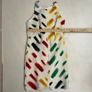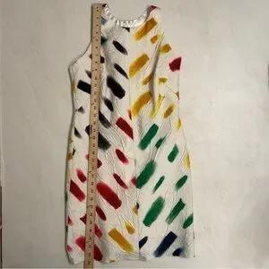 Stunning Milly sleeveless shift dress featuring a bold multicolor brushstroke print on a textured white fabric. High-quality construction, Made in the USA using imported Italian fabric. Fully lined with a silky satin interior for comfort. A standout statement dress perfect for events, parties, vacations, or photos.