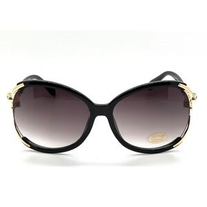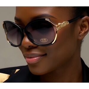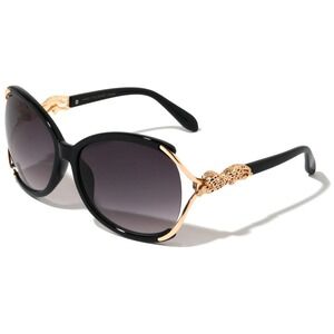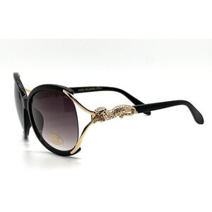 Statement sunglasses designed to turn heads, this pair features an oversized black frame accented with striking gold-tone hardware. The round silhouette is complemented by a unique gold-tone metal detail shaped like a leopard on each side, adding a touch of luxury and wild sophistication. These shades provide UV 400 protection, ensuring your eyes are shielded from harmful rays while maintaining impeccable style. The lenses showcase a subtle gradient tint, offering a chic and practical solution for sunny days. Perfect for adding a touch of glamour to everyday outings, summer vacations, or special events.
