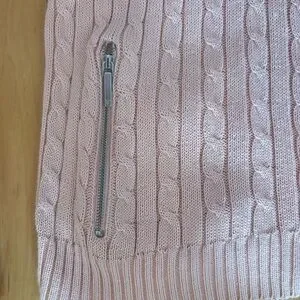 Classic and polished Lauren Ralph Lauren full-zip cable knit sweater in a soft light pink shade, size Medium. Features a signature embroidered crest logo, stand collar, zip-front closure, and zippered hip pockets for a tailored, elevated look. The cable knit texture adds timeless preppy style, perfect for casual wear, travel, or layering.