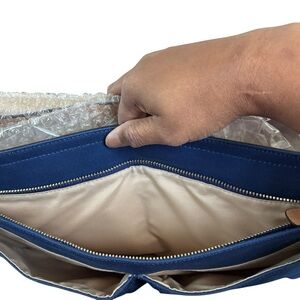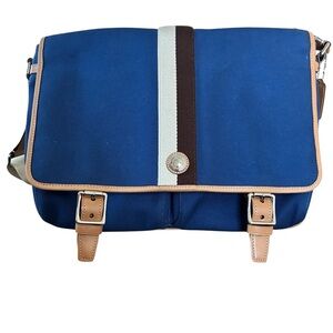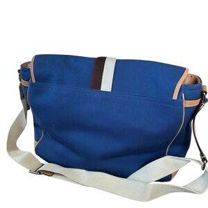 This a vintage-inspired crossbody designed for school, work, or travel. Durable blue canvas with tan leather trim and cream/brown racing stripe accents.