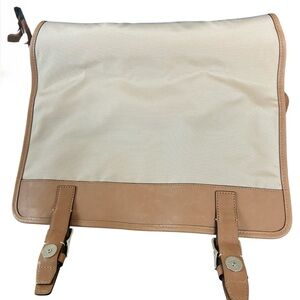Features: Includes a colorblock canvas design with a vertical cream and brown stripe, adjustable shoulder strap, and two front buckle-style magnetic snap closures.