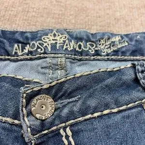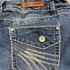 Trendy Almost Famous jeans in a medium wash denim with signature heavy contrast stitching and subtle distressing. Features embroidered back pockets, double-button closure, and slight stretch for a flattering fit. Stylish and comfortable — perfect for everyday wear or casual Y2K-inspired outfits.