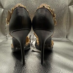 Stylish black Stilettos featuring strappy design with gold studs Perfect for parties , weddings, prom.