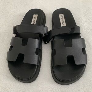 Women’s 8 STEVE MADDEN Mayven Black Leather H Flatform Luxe Slide Sandals