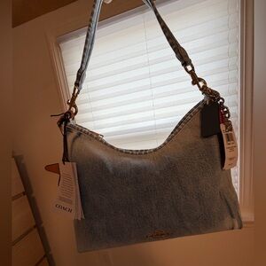 Denim refined pebble leather and smooth leather Inside zip and snap pockets Zip-top closure recycled polyester lining Detachable handle with 11 drop Detachable strap with 22 drop for shoulder or crossbody wear 12 1/4 (L) x 9 1/4 (H) x 4 1/4 (W) Denim specially treated for a love-worn look Exclusive of trim this denim style is crafted of cotton sourced from farms that use regenerative agricultural practices—those that help to maintain and rejuvenate land increase biological diversity and soil health and could lead to increased carbon absorption Style No. CEF26
