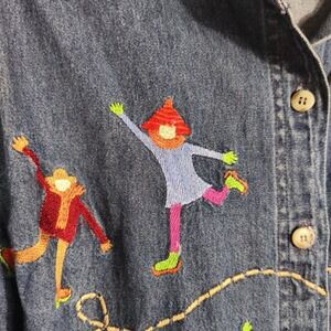 This unique embroidered denim jacket features colorful whimsical ice skating designs throughout. Perfect for cottagecore, grandma core, art teacher, or vintage inspired outfits. Lightweight 100% cotton denim with button front and relaxed fit. A standout statement piece for winter, holiday events, or festival layering.