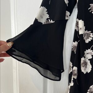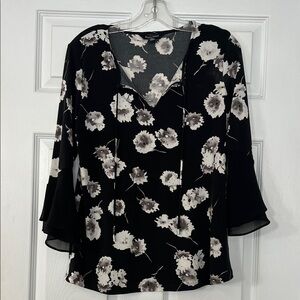 Elegant blouse with floral design. Features a V-neck and flared sleeves.