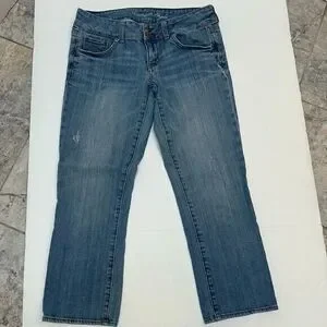 American Eagle Stretch Artist Crop Light Wash Distressed Jeans size 8. In good used condition and made of 99% cotton and 1% spandex. Lying flat, measures approximately 14 inches across the front of waist, 24 inches in the inseam and about 8 inches in the rise