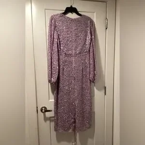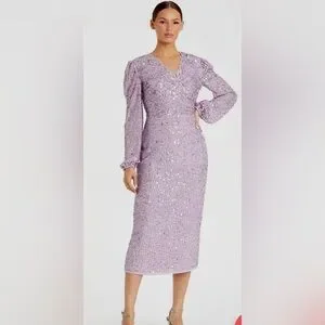 Shine bright and take center stage at your upcoming occasion in this Mac Duggal masterpiece. Sculpted for an impeccable fit, the dress is decorated with all-over linear sequins that give off an eye-catching sparkle. The surplice v-neckline, thin waistband, and full back design are captivating features. Its long puff sleeves offer warmth and beautiful coverage for your arms. The center-back slit facilitates easy movement, while the column skirt finishes the look as it cascades down to the sexy tea-length hemline.
