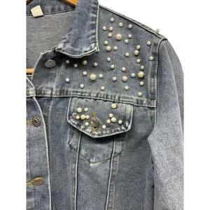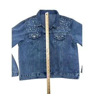 Bride Women's Denim Blue Jean Jacket With Pearls Wedding Bachelorette Sz XLarge