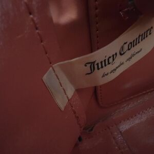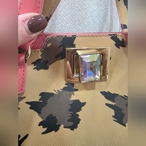 Juicy Couture Chic leopard-print structured tote with pink patent handles, gold hardware, and an iridescent gemstone clasp. Bag is sturdy and eye-catching with a clean pink interior. Shows some wear: light scratches on hardware, small marks on the exterior canvas, rubbing and minor cracks on pink trim, slight corner wear, and light scuffs on handles. Chain charm included.