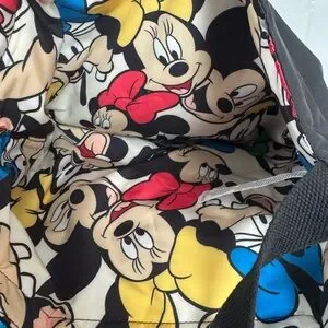 Stylish reversible sling bag featuring Mickey and Minnie Mouse. Black strap with colorful character design.