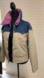 Stylish colorblock jacket featuring a pink collar and blue accents. Perfect for a trendy look.