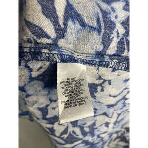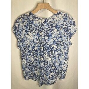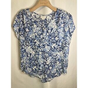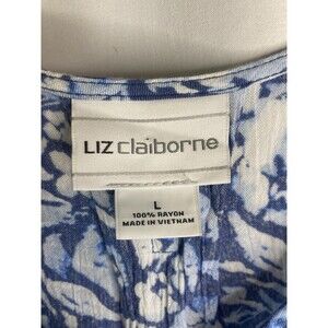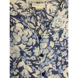 Liz Claiborne Summer Blouse Peasant L Blue Floral Top Button Up Sheer V-Neck