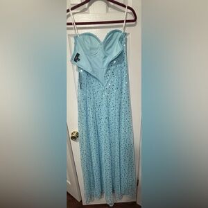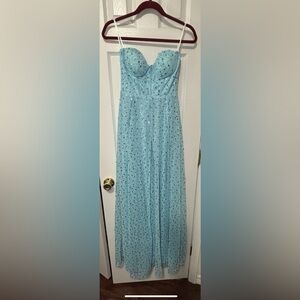 Elegant strapless maxi dress. Light blue with delicate detailing. Perfect for special occasions.