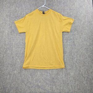Gildan t-shirt, yellow tee, crewneck shirt, short sleeve t-shirt, medium size yellow, casual t-shirt, solid color tee, men's yellow shirt, lightweight crewneck, tagless yellow shirt, cotton polyester blend, breathable yellow top, pre-owned medium shirt