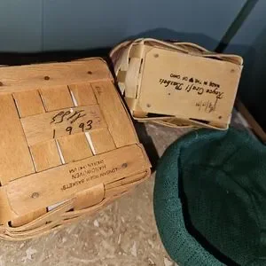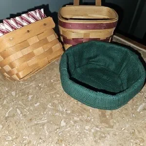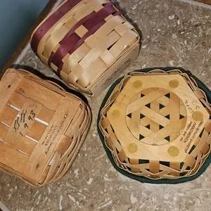 Set of three Longaberger baskets. Includes brown woven baskets with red accents. Perfect for home decor.