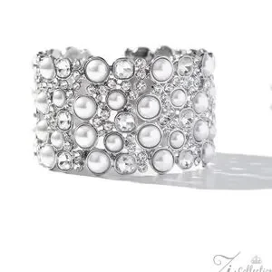Pressed in silver fittings, white half-pearls in varying sizes drip between white gems in sleek, rounded silver square frames and staggered clusters of brilliant white rhinestones that burst with opulence across the wrist, coalescing into an unapologetically posh, layered cuff.
