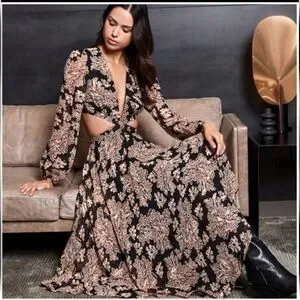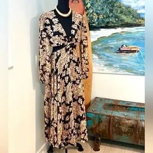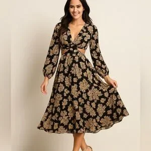 Gianni Bini, Marisol Jacquard Cut-Out in Amber Flower, Long Sleeve V-Neck Midi Dress, Excellent Condition, Size 10 (price pic is for reference only… it is a size 10). Effortless movement meets elegant allure in this Gianni Bini Marisol dress from Dillard’s Social Dressline. Designed with a flattering front waist cutout (subtle, not revealing), this flowy midi silhouette skims beautifully while the sheer long sleeves add softness and balance.