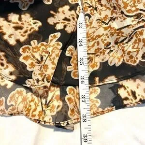The warm amber floral print pops against a classic black base, making this an ideal choice for cocktail parties, weddings, date nights, or fall events where you want drama without effort.