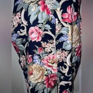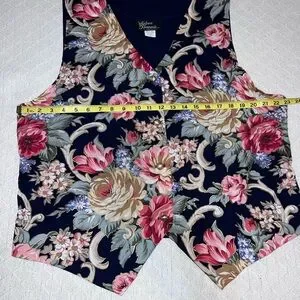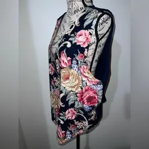Gorgeous vintage Silver Threads Ltd. floral vest, made in the USA and labeled size 1X. Features a rich navy background with romantic oversized florals in pink, cream, sage, and soft blue with elegant scroll detailing.