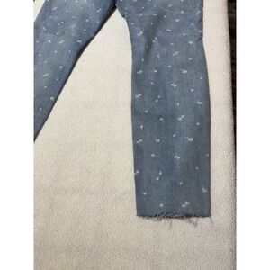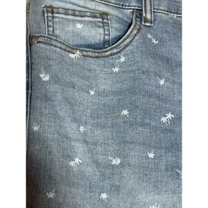 These are cute light denim mid rise stretch jeans by Tribal. They are a sz 8 with white embroidered palm trees all over and raw fabric at the ankle.