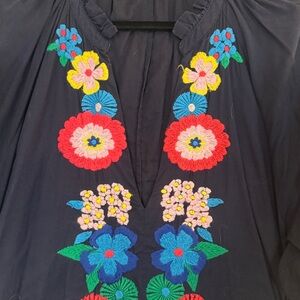 My favorite dress in my whole closet! This dress has been so versatile. I wear it to work, date nights, beach, and vacations. So easy breezy with a matching belt. Smocked sleeve edging with ruffled edge and collar, which is also ruffled in a mandarin style. The embroidery is unlike anything I’ve ever seen. Beautiful bright vibrant colors, fully lined and in great preowned condition. Very few loose threads. Has years and years left of life in her. If she still fit me, I would keep her forever. Size 14, and due to the voluminous maxi style could fit a 12, 14, 16, 18, 20, 22, large, extra large, double extra large, XXL just depending on how you like the fit.