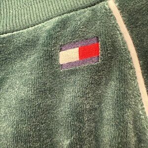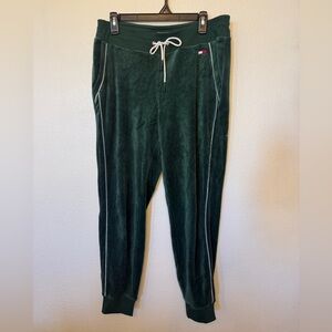 Tommy Hilfiger green velour like feel sport sweatpants in a rich green with iconic Tommy Hilfiger logo.
