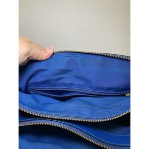 The Coach F36606 Christie Carryall Crossbody Handbag Purse in blue crossgrain leather is a stylish and versatile accessory for various occasions. This large satchel features a rectangular shape with a zip and magnetic closure, gold hardware accents, and a detachable strap for easy cross-body wear. The interior is lined with blue fabric and includes a mobile phone pocket, inner pockets, and an organizer for keeping belongings in order. The pebbled finish and classic bright blue exterior make this designer handbag a chic addition to any outfit, whether for travel, workwear, or a casual day out.