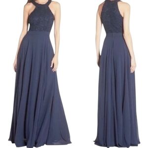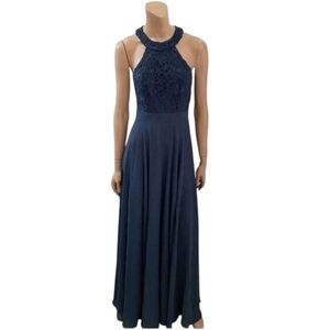Lulu's Navy Blue Chiffon Lace Bodice Halter Gown NWT Sz L