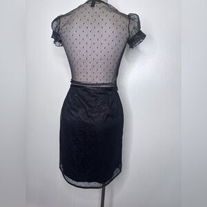 Rare vintage Betsey Johnson New York two-piece set featuring a sheer black mesh top and matching skirt with delicate embroidered floral details. Classic Betsey feminine-meets-edgy design with a romantic Y2K vibe.