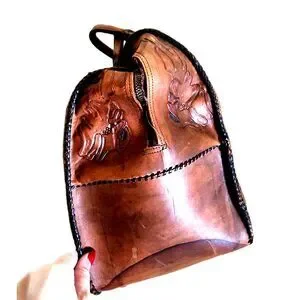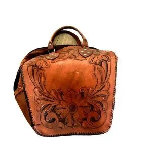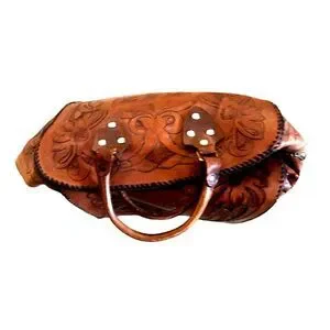 Vintage Etched Brown Tan Leather Embossed Handbag Bowling Bag Tote Bag Western