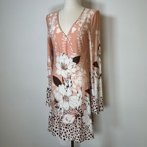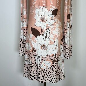 VENUS floral & Cheetah print dress women’s size small. Long bell sleeve, v-neck, peach, tan and white, plenty of stretch, lightweight. Very good preowned condition. Approximate measurements 35” top of shoulder to hemline, 16” across chest, 26” sleeves.