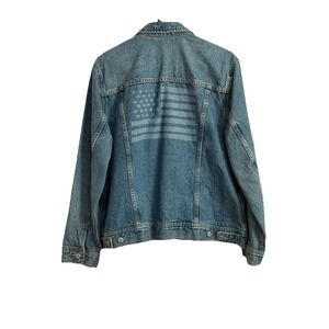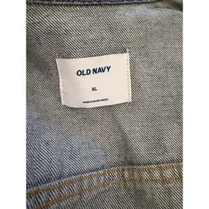 The product is a classic denim jacket from Old Navy in size XL, featuring an American flag on the back. Made from 100% cotton denim, this short-length jacket has long sleeves and a button closure. It is designed for casual occasions and is machine washable. The jacket also includes inner pockets and is suitable for all seasons, making it a versatile addition to any woman's wardrobe.