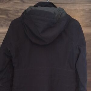 Note on Color: There is some light, natural fading to the black fabric (mostly visible along the seams and edges) from normal wear and washing. This is purely aesthetic and does not affect the waterproof performance or warmth of the jacket. No rips, holes, or stains.