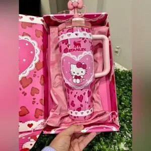 Charming Stanley 40 oz tumbler featuring Hello Kitty and heart patterns. Adorable pink design with a sturdy handle. Straw topper matching box and dust bag included.