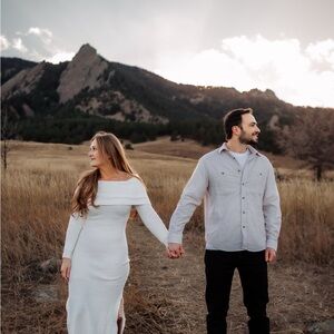 Elegant off-shoulder design. Soft cream color. Perfect for any occasion. Worn once for my engagement shoot. Such a beautiful dress!