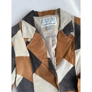 A fantastic y2k patchwork suede jacket in cream, dark brown, and tan.