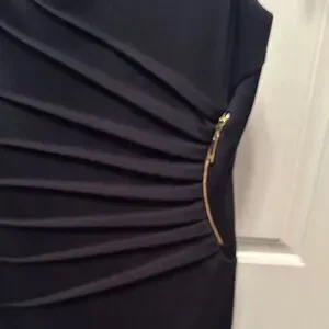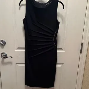 Elegant black midi dress by Ivanka Trump. Features stylish pleat accents. Ideal for formal events.