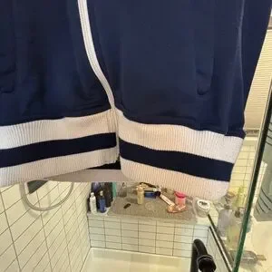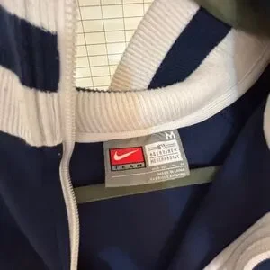 Dark blue track jacket with white trim. Features Yankees logo and zip closure. Some slight wear and piling on cuffs and hem. See pictures. Otherwise in perfect condition.