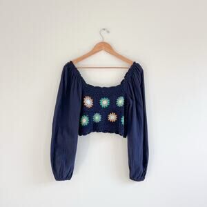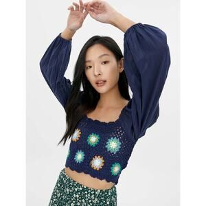 Aerie NWT Crochet Vacay Puff Long Sleeve Floral Cropped Top, Size Small