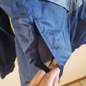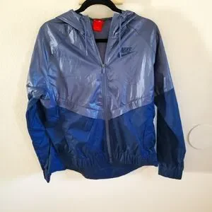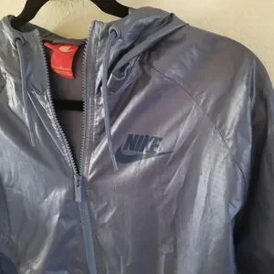 Stylish blue windbreaker jacket by Nike. Features a hood and zip closure.