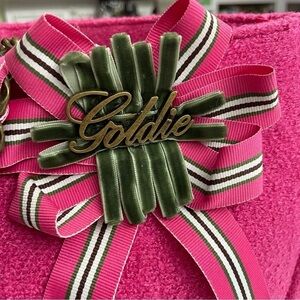 Pink, white, green brown ribbon through chain Iconic bow with brass & velvet Goldie embellishment on front of bag