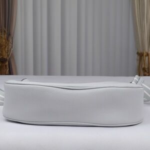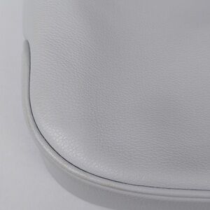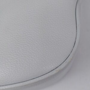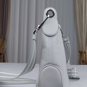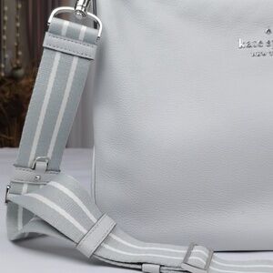 Beautiful pastel gray pebbled leather with detachable adjusting material strap. Beautiful shape. Plenty of interior space with open and zippered pockets.
