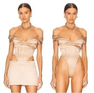 The corset bodice features off-the-shoulder straps and a gathered bust with boning that then cascades into exaggerated high cutouts at the hip.