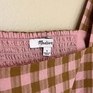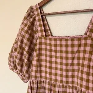 Madewell Pink and Olive Green Gingham Plaid Mini Babydoll Puff Sleeve Dress